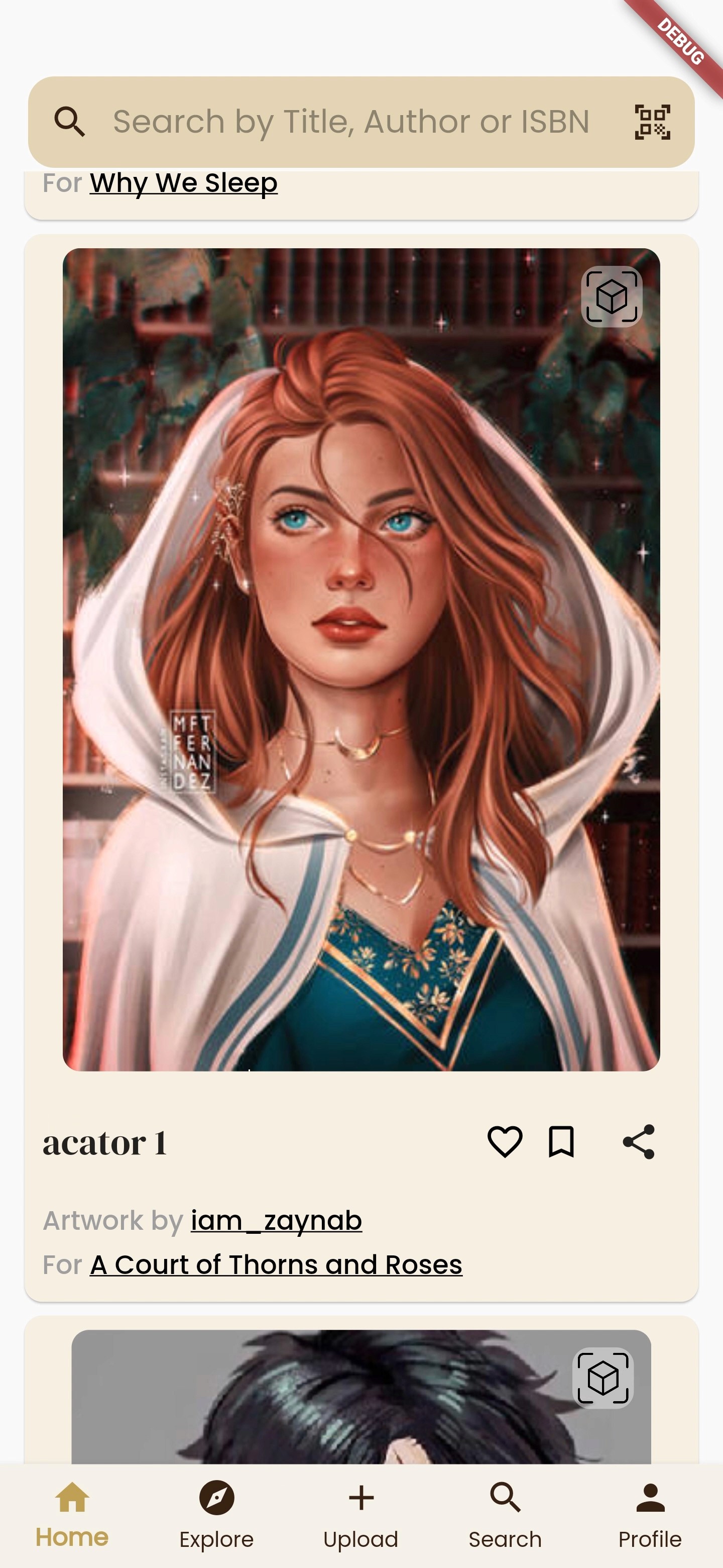 The homepage feed is personalized, showcasing alternative covers and artworks related to the books users follow, as well as creations by the artists they follow. Each post displays the artwork, artist name, and linked book title. Users can tap on a post to explore the book further, or interact by liking, saving, or sharing the artwork — making discovery both meaningful and engaging.