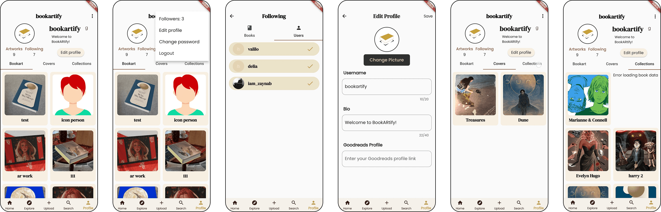 The profile section offers a personalized space for users to manage their presence on BookARtify. They can view their uploaded artworks, covers, and collections, edit profile details such as username, bio, and Goodreads profile link, and easily track their following activity. Simple options for changing the profile picture, updating passwords, and managing followers ensure a smooth and intuitive account management experience.