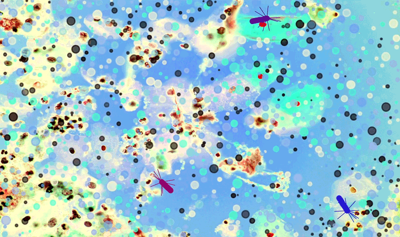 This project visualizes a dynamic microscopic ecosystem through creative coding in Processing. Inspired by real microscopic imagery, cells and bacteria were programmed with properties such as motion, interaction forces, and visual stylization to mimic organic behavior. The bacteria respond to user input—gravitating toward mouse clicks—while the scene blends physics, coding, and design to show how interactive visuals can transform abstract scientific concepts into engaging digital experiences for education, storytelling, or brand communication.