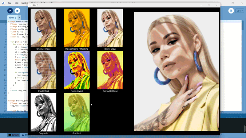 This project explores how images can be transformed through code. Using Processing, I developed filters that stylize photographs at the pixel level—experimenting with brightness thresholds, halftone effects, and color quantization. By programming these effects instead of applying them through design software, the outcome is a flexible system that can generate unique visual styles for campaigns, brand content, or digital storytelling.